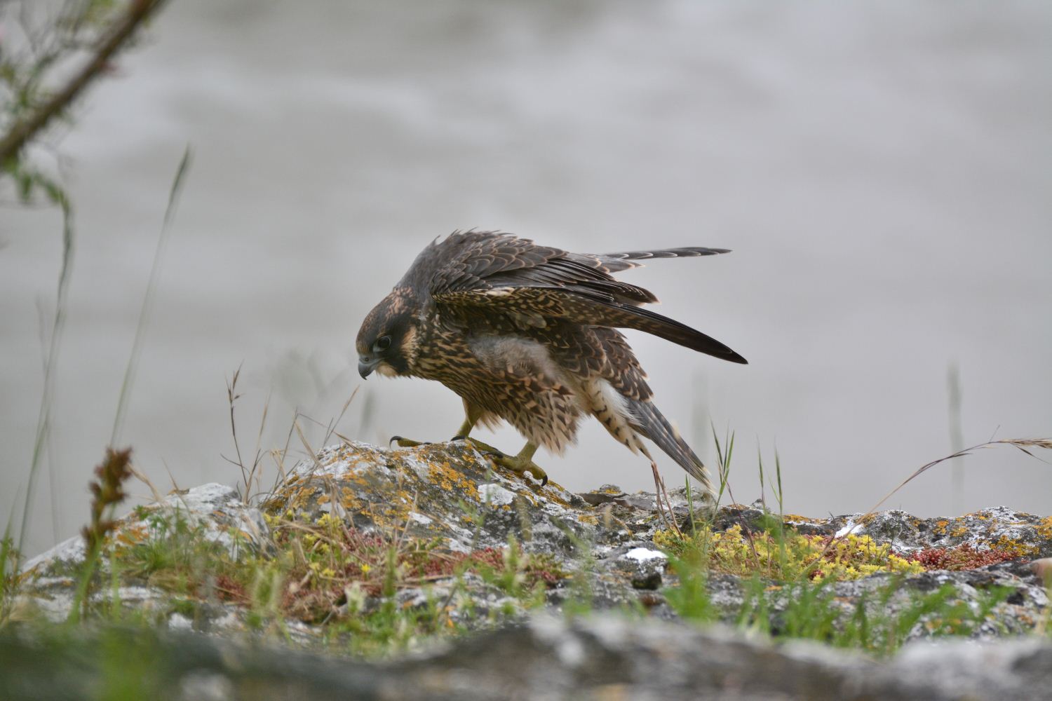 Photo prise le 14/06/2016. Jeune faucon pèlerin gambadant au sommet d'un promontoire rocheux surplombant la vallée de la Seine.