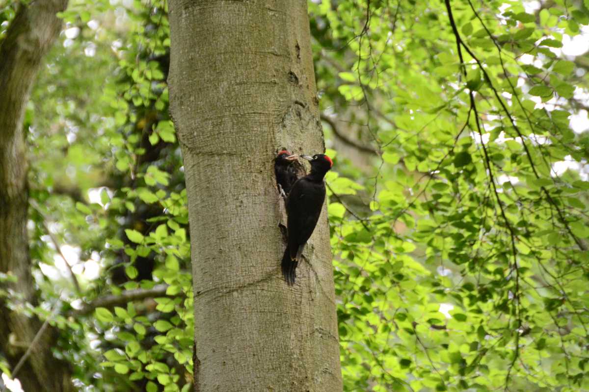 Photo prise le 03/06/2016 à l'affût, alors que rodait un Pigeon colombin (Columba oenas) autour du site. Nourrissage d'un jeune Pic noir à la loge par sa mère (reconnaissable à sa calotte rouge plus limitée).