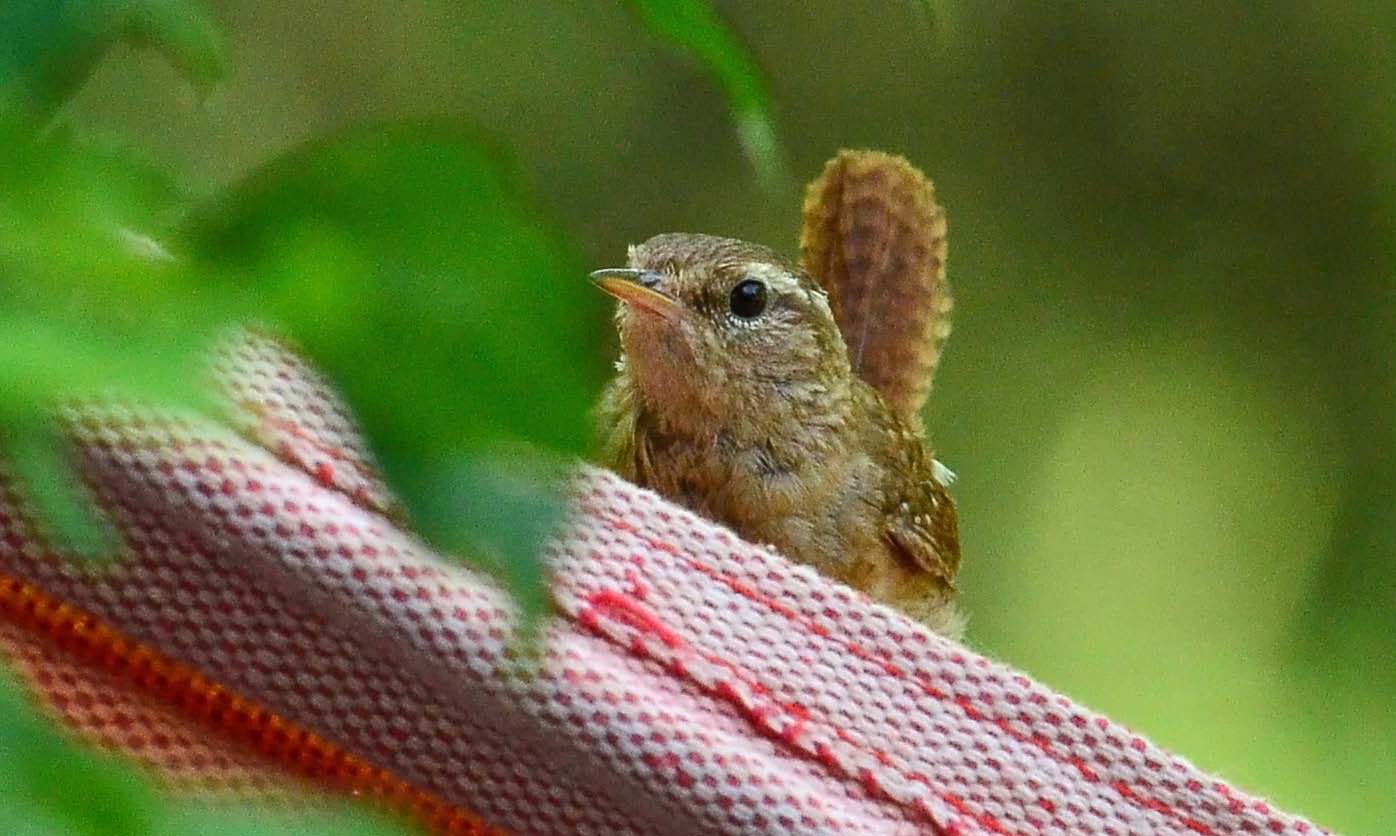 Photo prise le 01/07/2014. ll nichait dans un lierre tout près de notre petit coin de sieste, et lui aussi semblait apprécier le hamac !