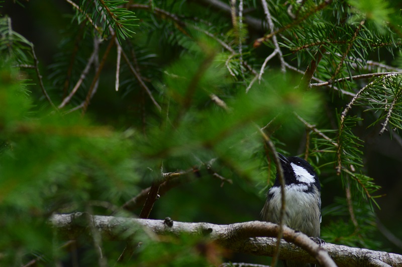 Photo publiée le 12/08/2015. Assis dans l'herbe, j'ai diffusé le chant d'une mésange au hasard, et voilà qu'une Mésange noire est apparue pour défendre allègrement son territoire. Je suis resté une heure à l'observer au pied des conifères : mais c'est ça la passion !