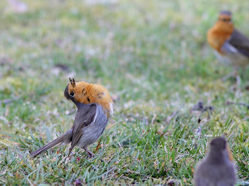 Photo prise le 04/04/2020. Le Rougegorge familier est particulièrement territorial au printemps (mais aussi en hiver, lire Chez les rouges-gorges en hiver, point de galanterie), défendant activement son domaine contre les autres espèces et ses congénères. L'une des postures d'intimidation du mâle est spectaculaire : sans émettre de bruit ou presque, il rejette sa tête en arrière et légèrement de côté, et il gonfle les plumes orangées de sa gorge. Toutefois, son comportement nuptial est assez proche, et il est difficile d'écarter définitivement une parade.