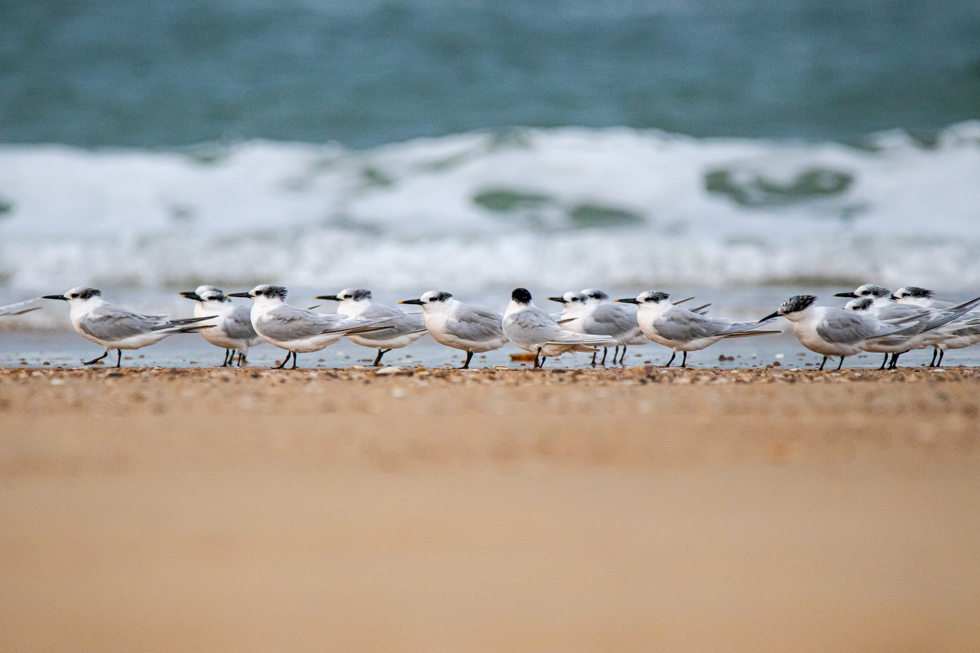 Photo prise le 24/01/2020. Un groupe d'environ 142 Sternes caugeks au niveau des bunkers, au nord la pointe de Cap Ferret, côté océan et à marée basse.