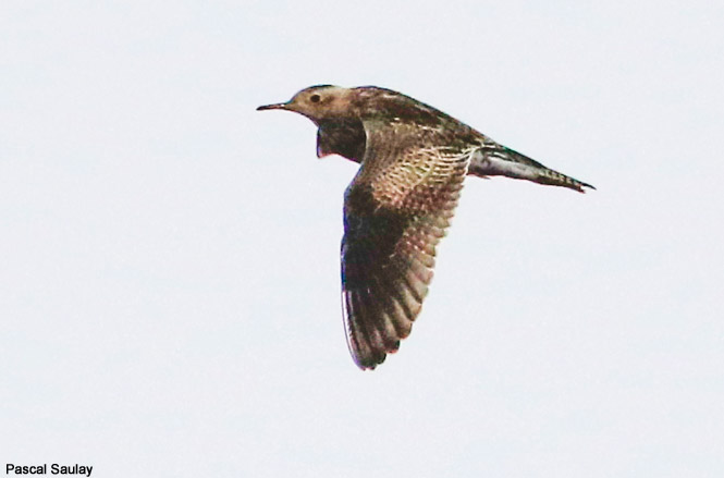 Photo prise le 12/10/2019 par Monsieur Saulay Pascal . Découverte le 12/10 par Jean-Philippe Siblet, vue en vol et posée dans le secteur du fort du Kernic : Aod Bihan, Kerzoncou, Porz Kinzy, Rulann, Aod Bihan et Beg Piniglou et Rulann (téléchargez notre carte des bons sites d'Ouessant). Limicole des prairies nord-américaines très rare en Europe (moins de 10 données en France depuis 1965), de taille moyenne, ressemblant aux courlis mais avec un bec court et droit.