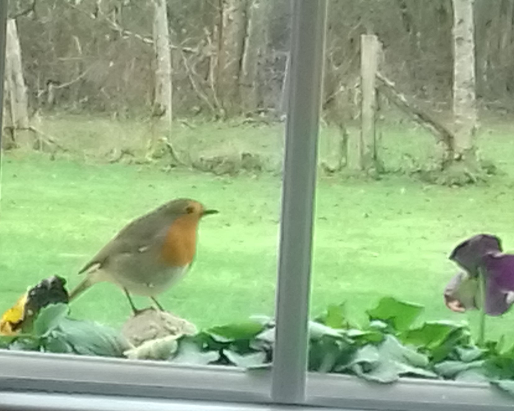 Photo prise le 05/04/2019 par Madame haie Marie-José . Je vous présente mon rouge-gorge qui tous les matins vient picorer sa boule de graisse pendant que je prends mon petit déjeuner. On se regarde et la journée commence bien. Il sautille parfois dans me fleurs et je me mets à penser que c'est peut être celui que j'ai soigné et caressé.