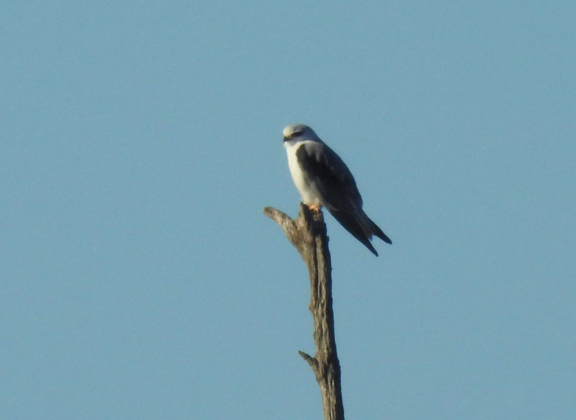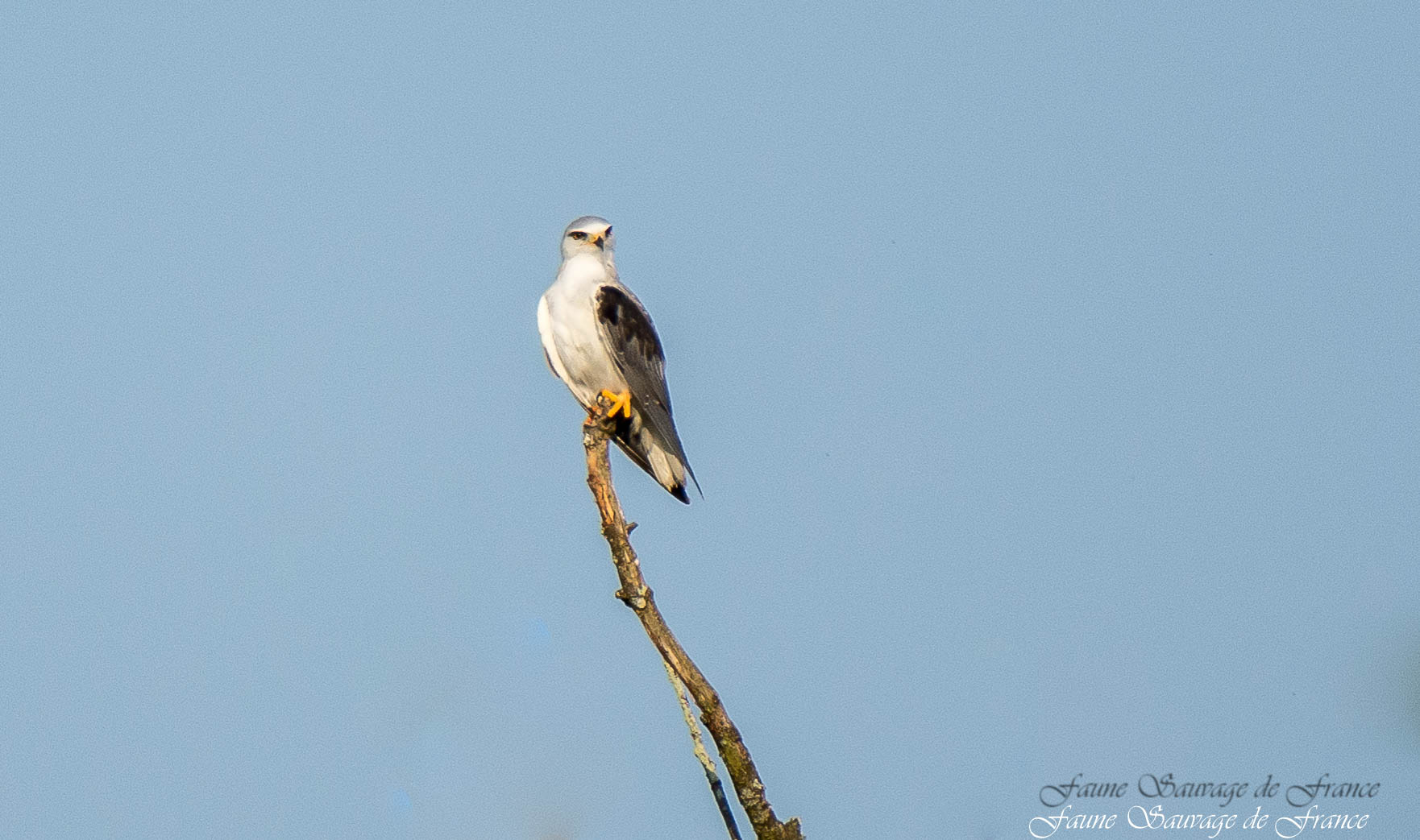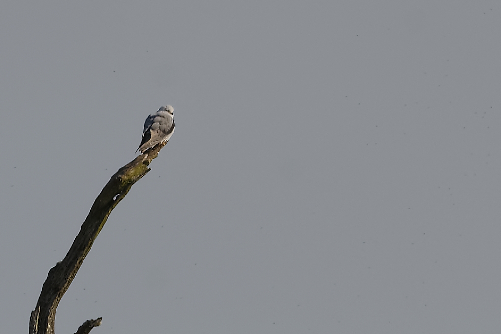 Photo prise le 06/08/2018. Un élanion blanc adulte était posté en haut d'un arbre mort. Lire L'Élanion blanc poursuit sa forte progression en Europe et au Moyen-Orient.