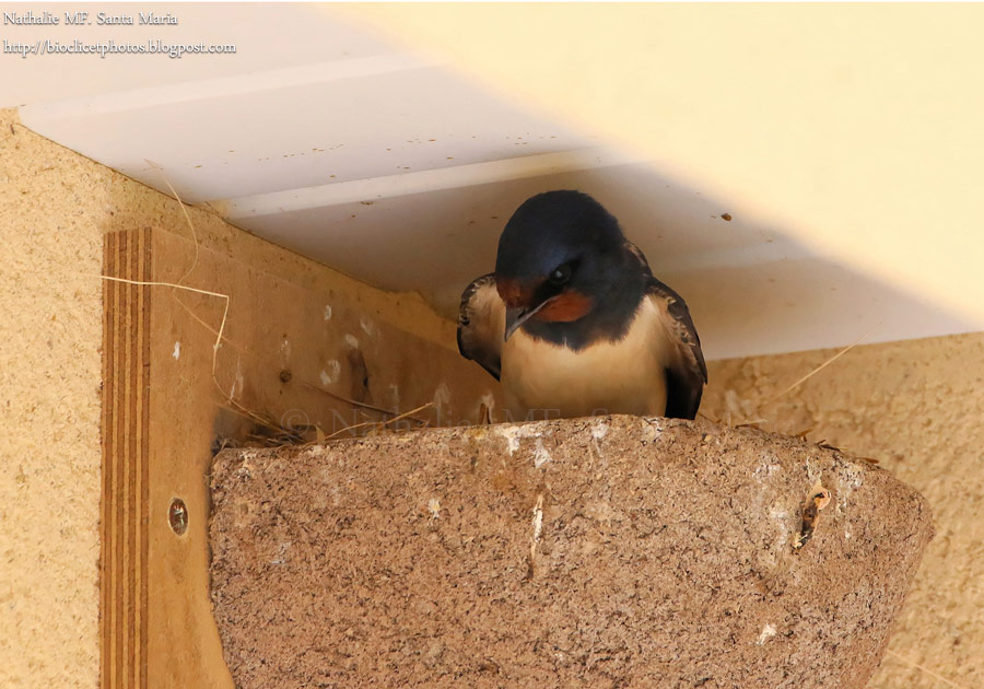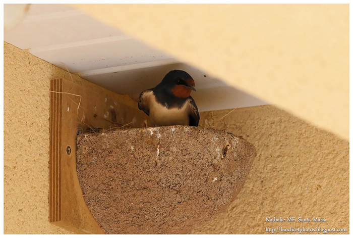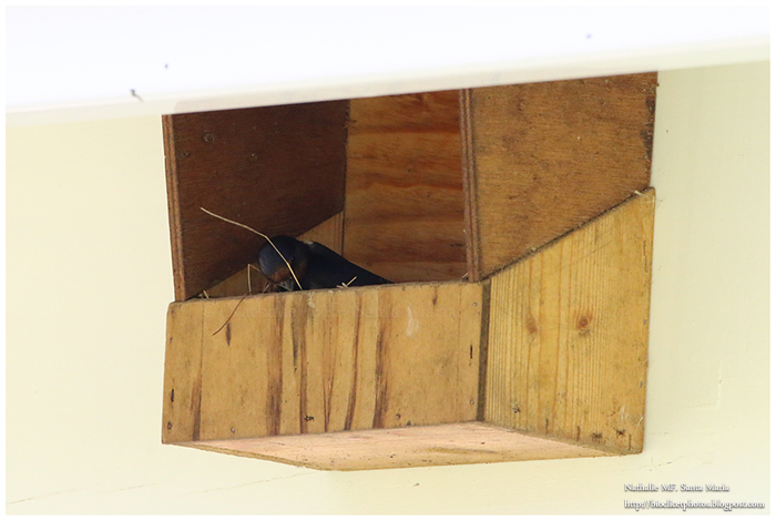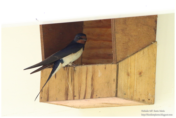 Photo prise en juin 2016. L'Hirondelle rustique ne se contente pas d'occuper le nichoir artificiel. Elle le garnit sur le haut ou dans sa totalité, de boue mélangée aux foins fraîchement coupés du prés voisin. Le nichoir est-il trop grand ? Ou pas assez confortable ?