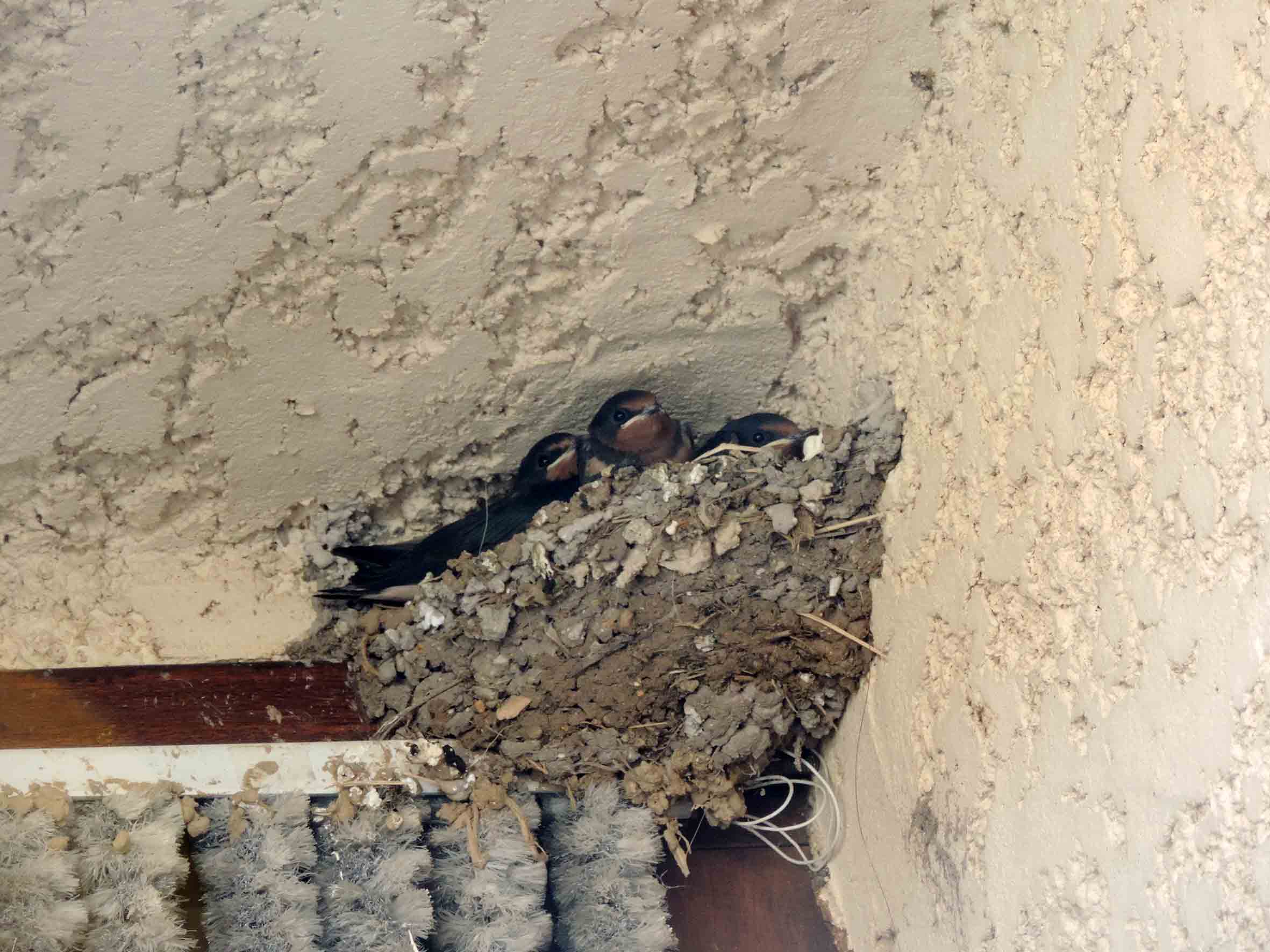 Juvéniles d'hirondelles rustiques dans un nid construit dans l'angle supérieur droit d'une porte d'entrée. La porte s'ouvrant à l'opposé du nid, cet emplacement n'a pas posé de problème.