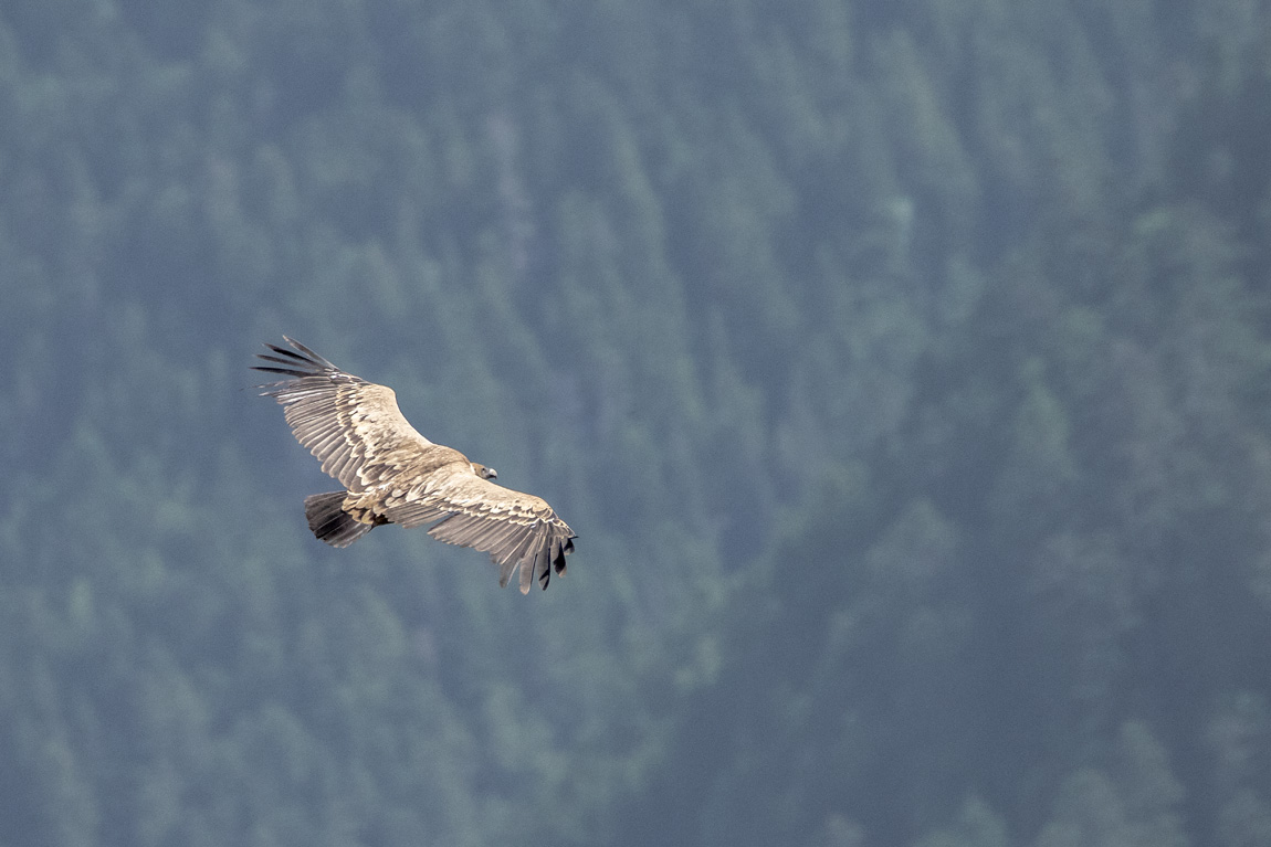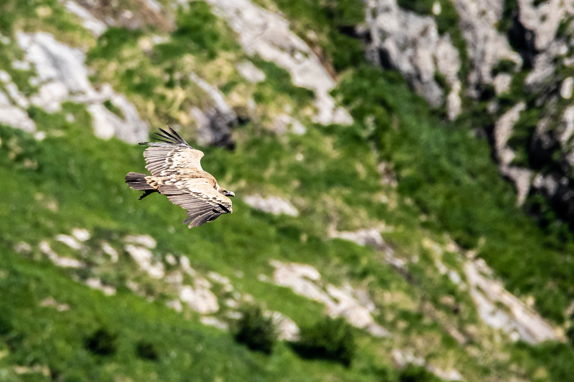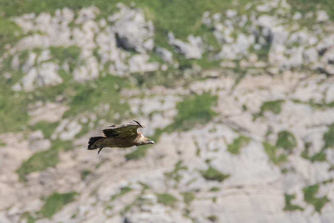 Photo prise le 11/07/2017. Parmi les 50 vautours présents ce jour là, nous avons surpris celui-ci au détour d'une barre rocheuse. Comme il n'avait pas assez de place pour décoller, il a été obligé de marcher devant nous (à moins de 10m) avant de se jeter dans le vide quelques mètres plus loin. Photo non recadrée.