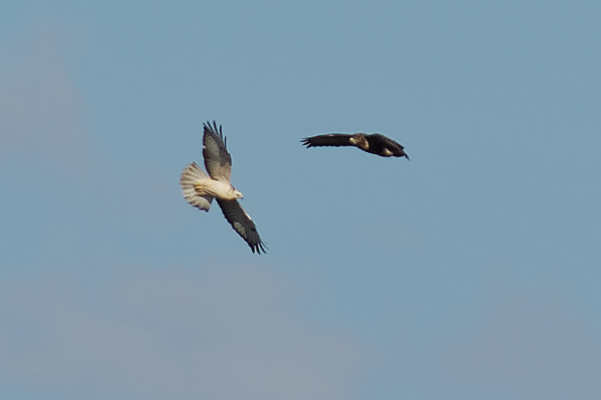 Photo prise le 14/10/2018. Comme souvent avec la forme claire de la buse variable, on croit à une observation exceptionnelle : Circaète Jean-le-Blanc ou Élanion blanc, mais comme ce fut encore le cas pour moi cette fois-ci, c'était juste une Buse variable très blanche. Sur ce cliché elle est accompagnée d'une congénère au plumage "normal" : elle n'est pas dite variable pour rien notre buse !