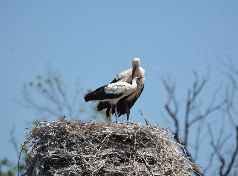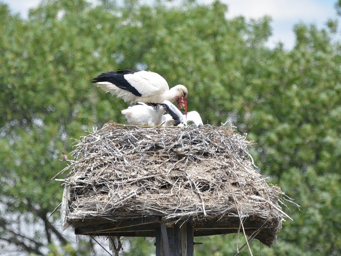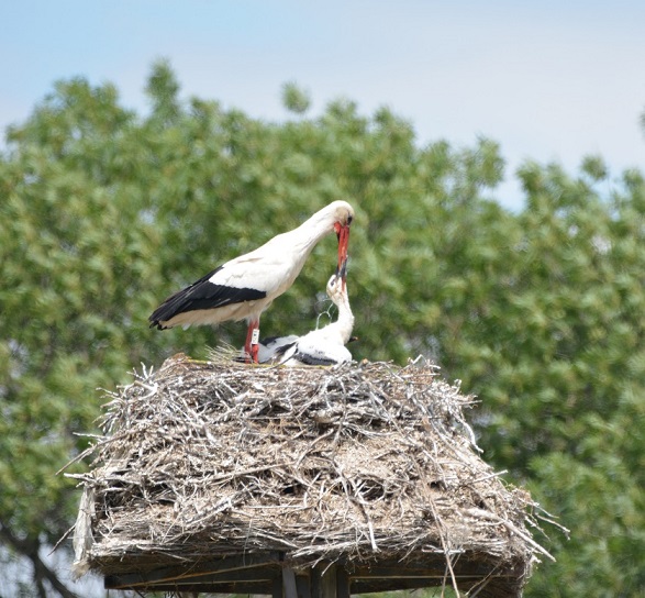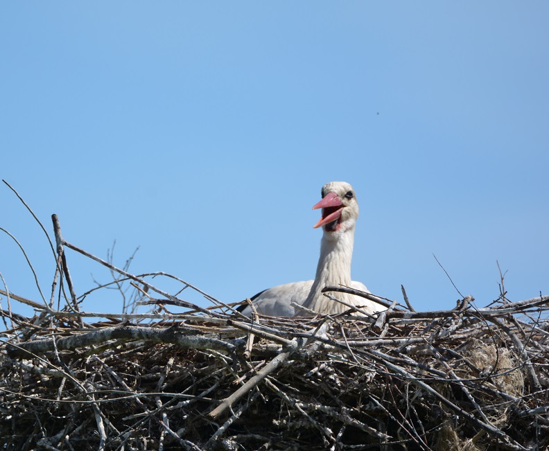 Photo prise le 03/06. On voit bien la cigogne qui régurgite de la nourriture pour ses petits : nourriture ou lait de jabot ?