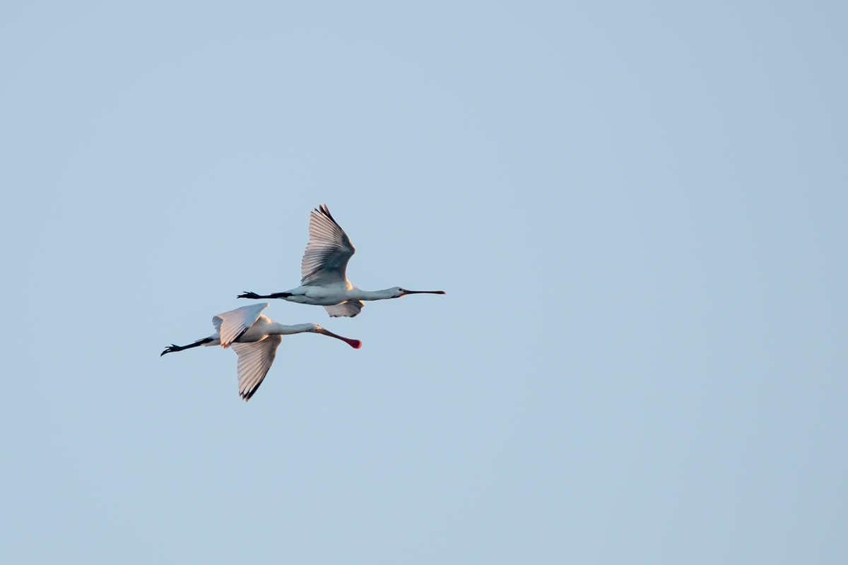 Spatules blanches en vol