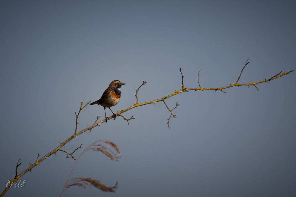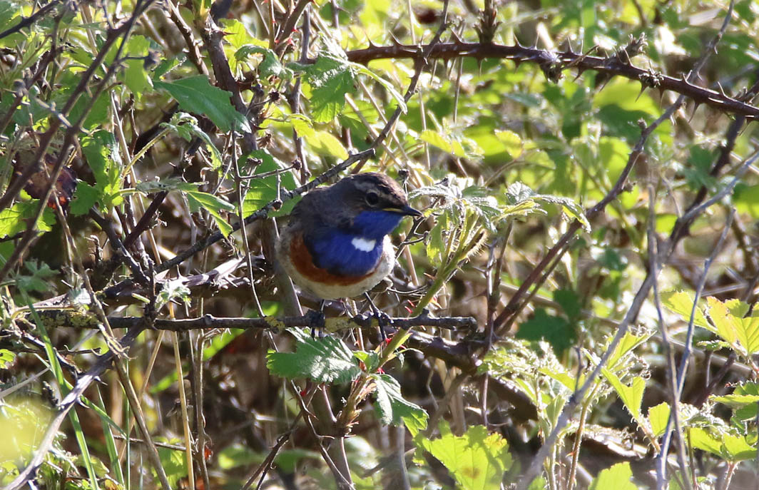 Photo prise le 04/05/2016. Sous-espèce nammetum. L'un des derniers chanteurs de l'île, début mai c'est un peu tard pour les observer. La sous-espèce nammetum se distingue de la sous-espèce cyanecula qui niche dans le nord et l'est de la France par ses caractéristiques génétiques (basée sur l'analyse de l'ADN mitochondrial) , sa taille légèrement inférieure, la longueur de l'aile pliée étant inférieure à 72 mm chez le mâle, alors qu'elle peut atteindre 80 mm chez cyanecula, son poids moindre (moins de 20 grammes chez le mâle et jusqu'à 25,5 grammes chez cyanecula), et le dessus du corps gris-ardoise et non pas gris-brun.