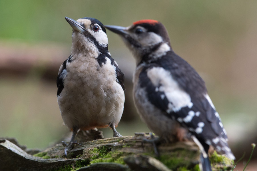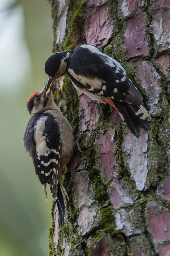 Pic épeiche nourrissant son jeune