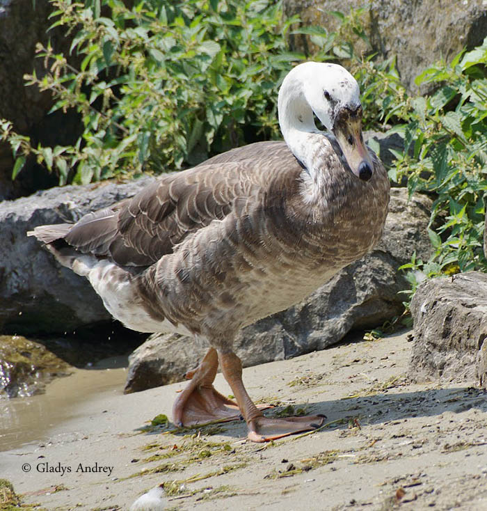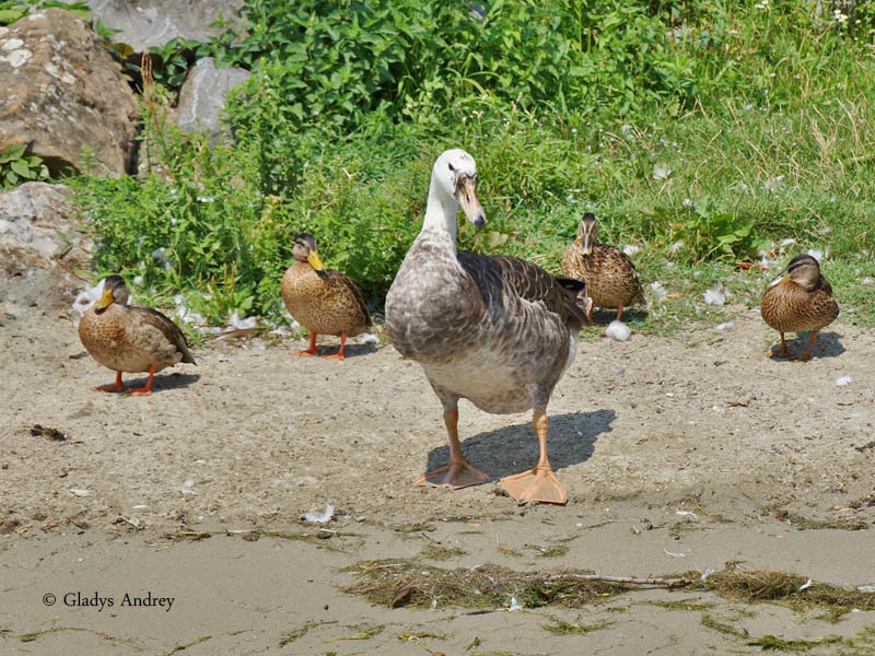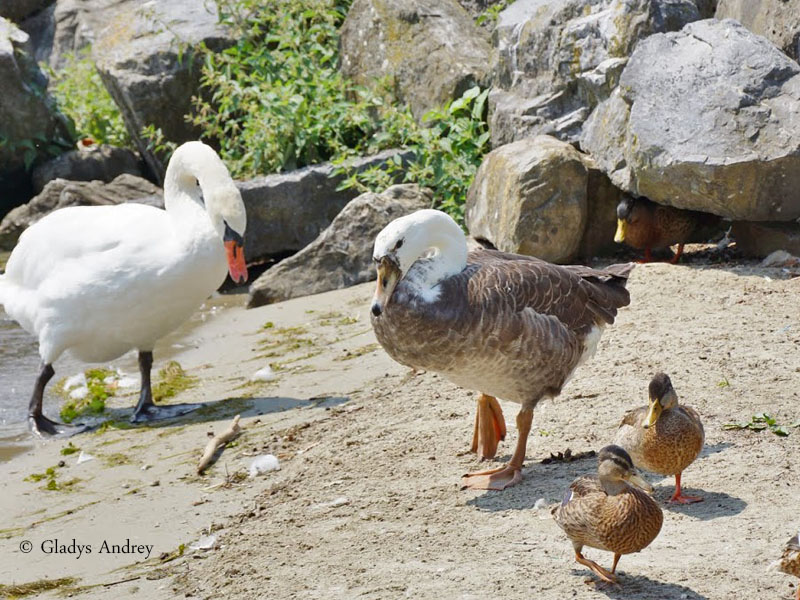 Photo prise par Gladys Andrey le 11/08/2015. Hybride entre un Cygne tuberculé et une Oie cygnoïde photographié sur les rives du lac Léman à Vidy (Suisse). Visitez la page GGogle + de Gladys Andrey.