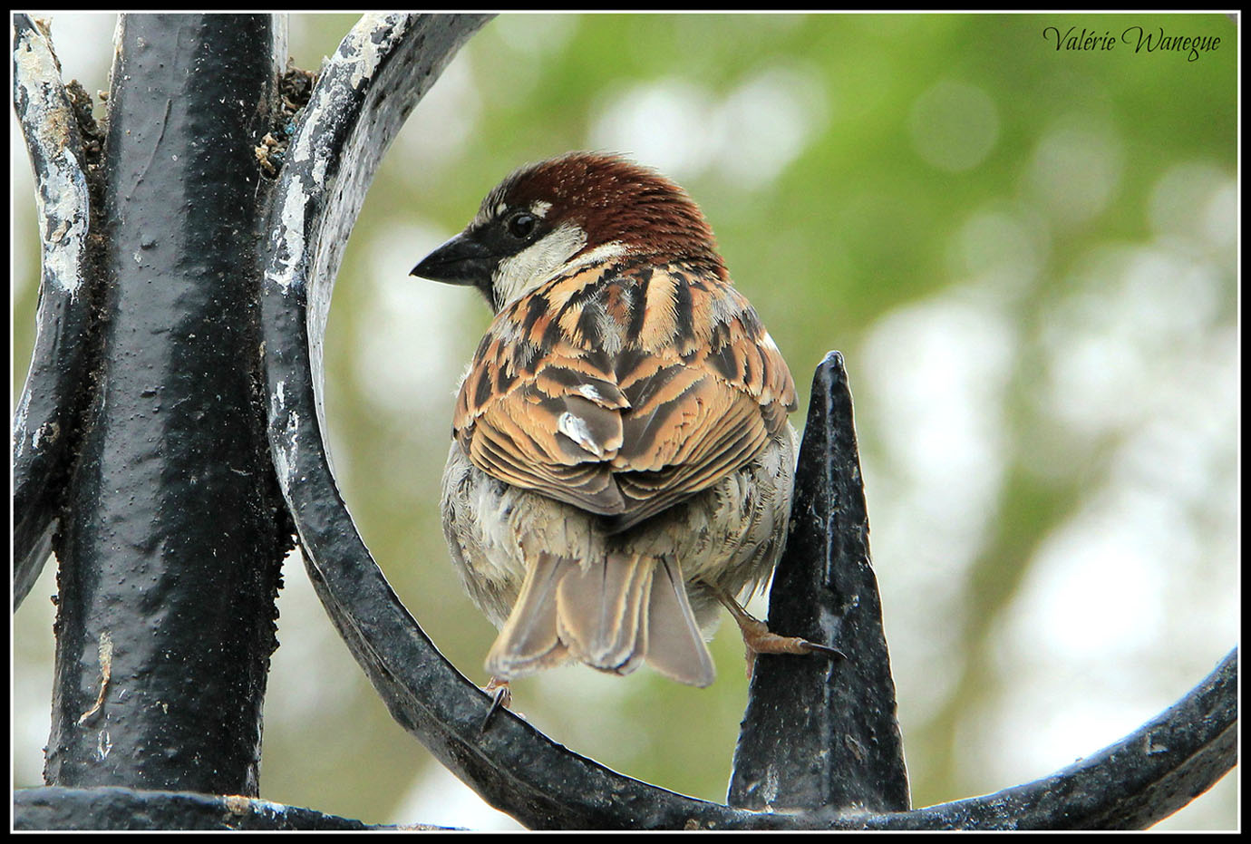 Perché sur les grilles du square de Notre-Dame de Paris. Photo prise le 31/03/2012. Lire Le déclin du Moineau domestique à Londres et à Paris.