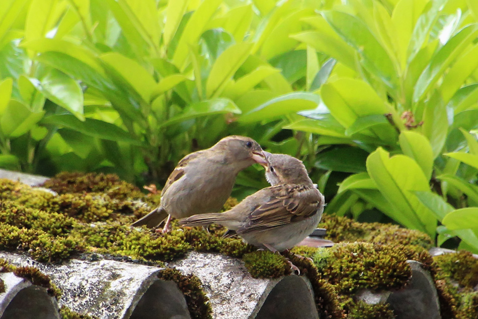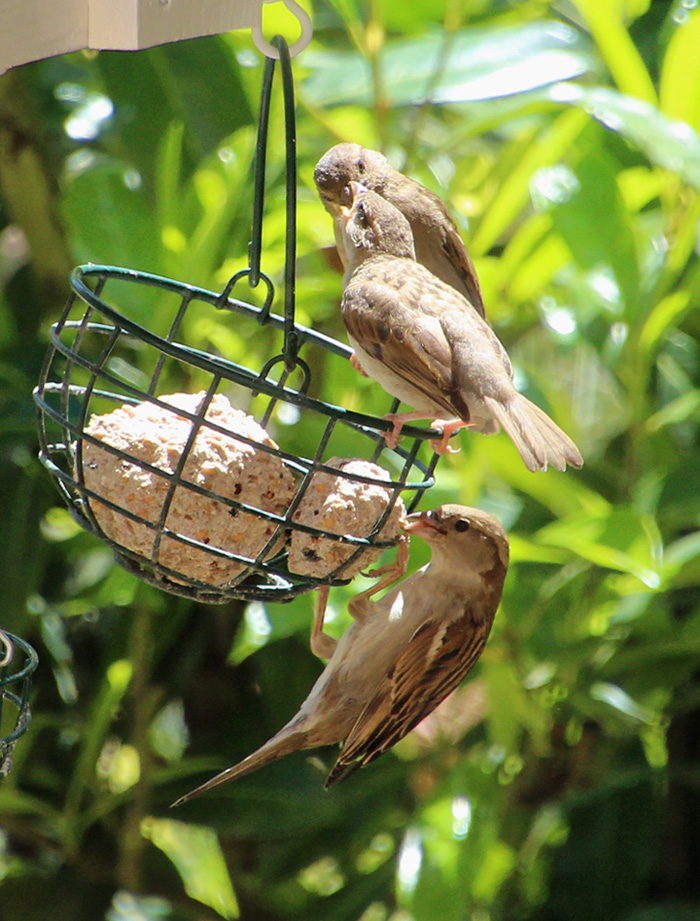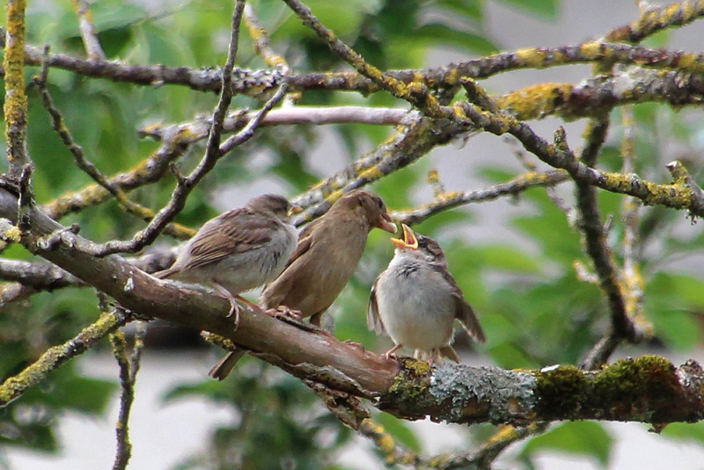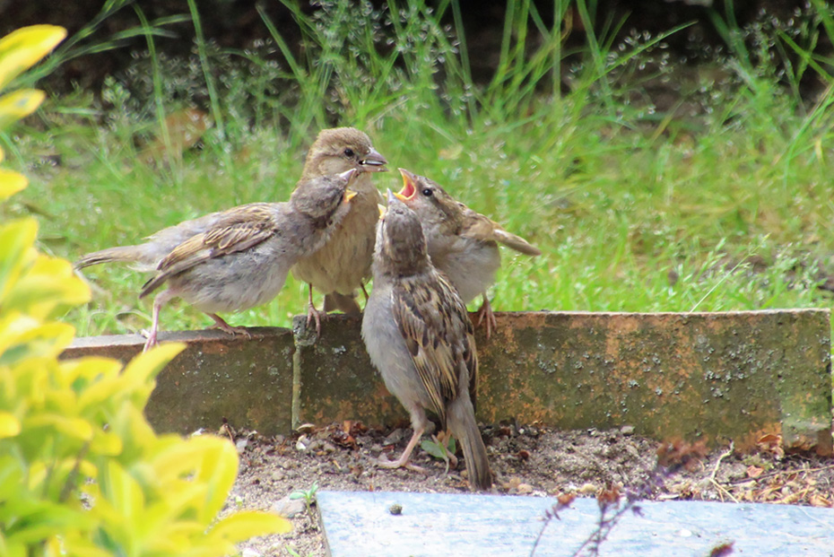 Beaucoup d'animation au jardin : nombreux petits nourris par leurs parents.