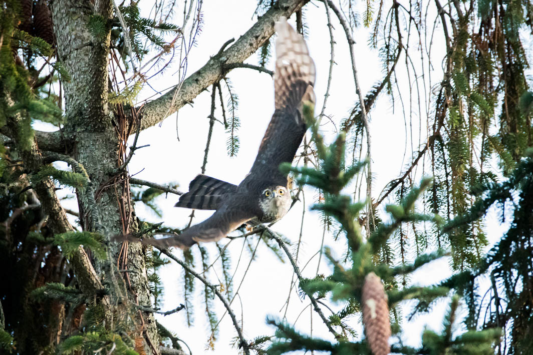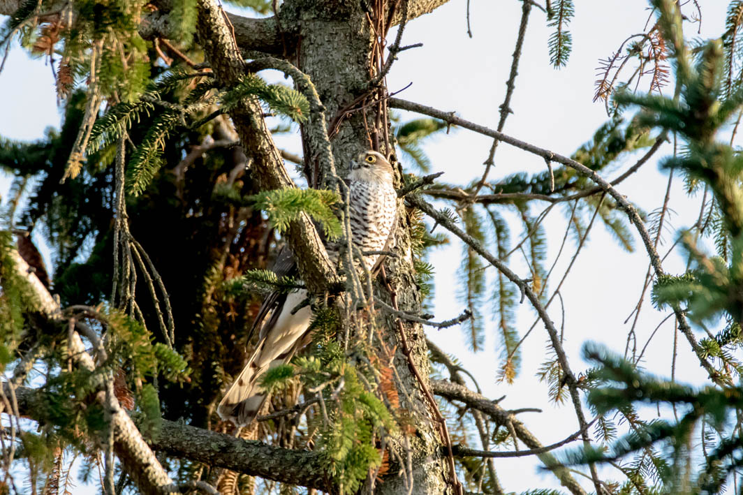 Photo prise le 30/11/2018 par Marc Le Moal. Cet épervier a raté sa proie (un Etourneau sansonnet ou une Tourterelle turque) et est resté quelques minutes dans l'arbre.