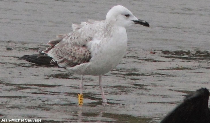 Oiseau de première année calendaire bagué en Pologne photographié le 02/12/2018 par Jean-Michel Sauvage. Notez les longues pattes, le front fuyant, le bec plus fin que celui d'un Goéland leucophée, la tête blanche mettant en évidence les yeux noirs, le dessous blanc, les scapulaires gris pâle faiblement marquées de sombre, et le bec noir avec un peu de rose à la base.