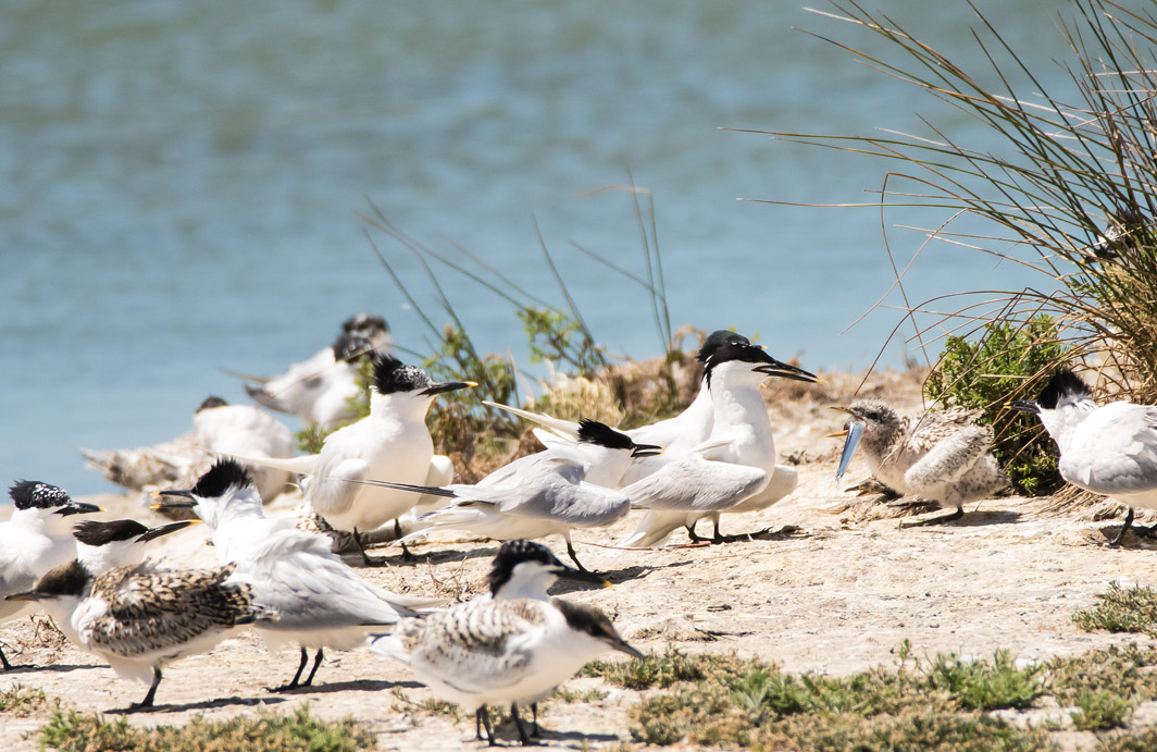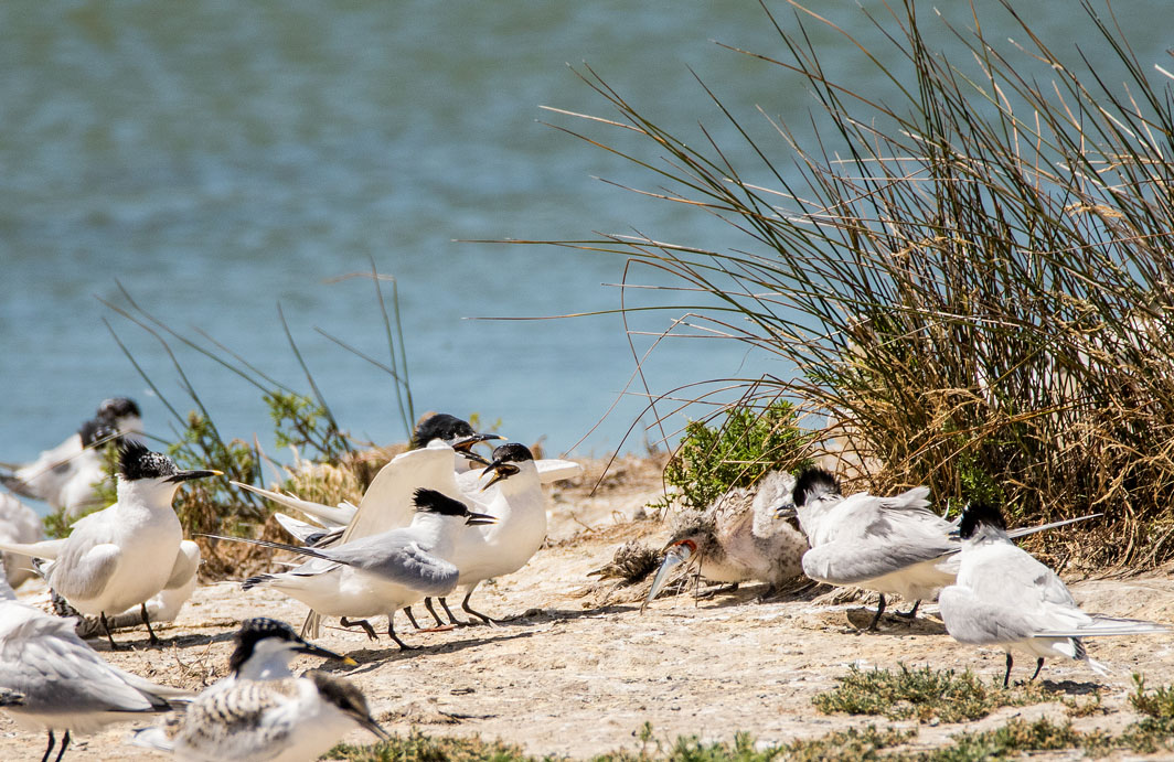 Sternes caugeks adultes et juvénile avec un sprat dans le bec