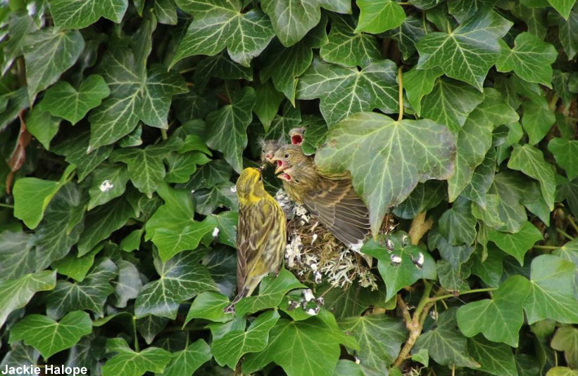 Serin cini et ses petits dans le lierre