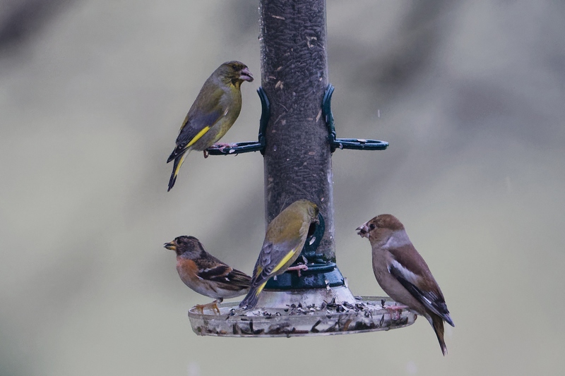 En plus des "habituelles" Mésanges bleues, charbonnières et nonnettes, des Sittelles torchepots, des Verdiers d'Europe, des Pinsons des arbres, des visiteurs moins communs sont venus s'y nourrir en nombres inhabituels : Gros-becs cassenoyaux (lire L'automne 2017 et l'afflux des Gros-becs cassenoyaux en Europe de l'Ouest ), Mésanges noires, Pinsons du Nord et Chardonnerets élégants.