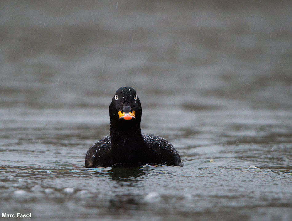 Photo prise le 03/01/2018. Visitez ma galerie de photos. Suite aux tempêtes Carmen et Eleanor qui ont balayé l'ouest de l'Europe depuis le début de l'année 2018, des oiseaux hivernant normalement en mer (mouettes, plongeons, canards marins, océanites...) ont été emportés sur les plans d'eau de l'intérieur, comme ce beau mâle de Macreuse brune découvert sur les étangs de Stavelot, dans l'Ardenne belge. Lire nos articles Identifier les macreuses dans des conditions difficiles et La tempête du 8/12/2006 et la forte arrivée d'Océanites cul-blanc.