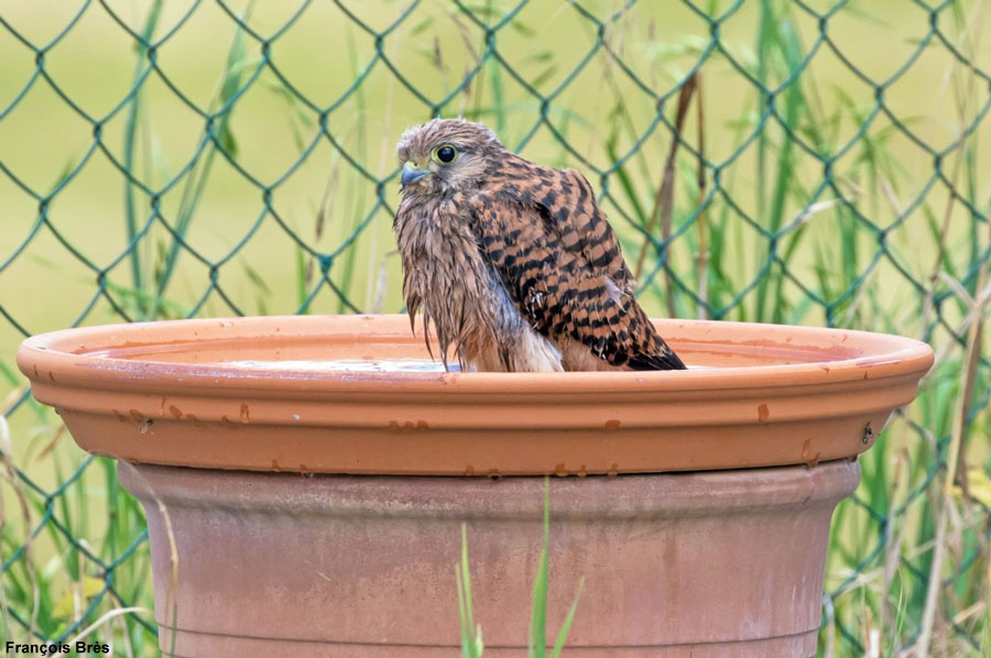 Faucon crécerelle se baignant dans la coupelle d’un pot de fleurs