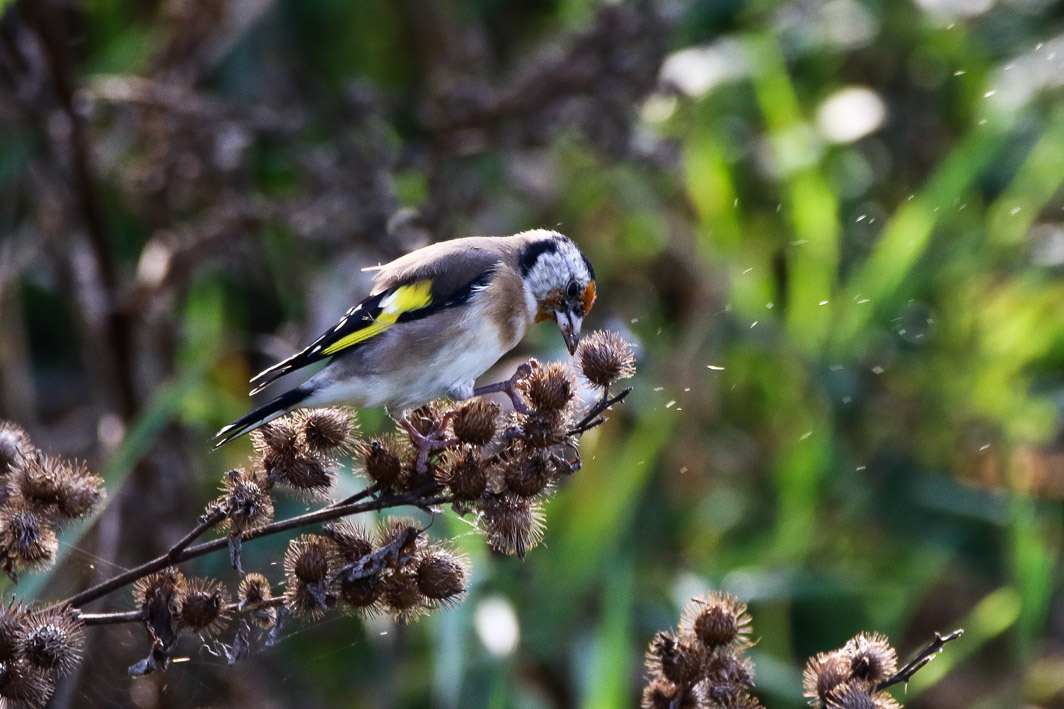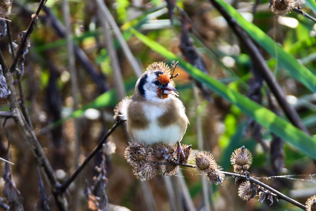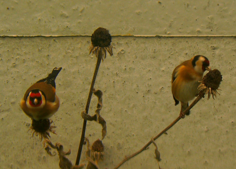Photo prise le 29/01/2018. Chardonnerets apprécient les graines de gaillardes (lire Semez ou laissez pousser des fleurs qui produisent des graines pour les oiseaux ).