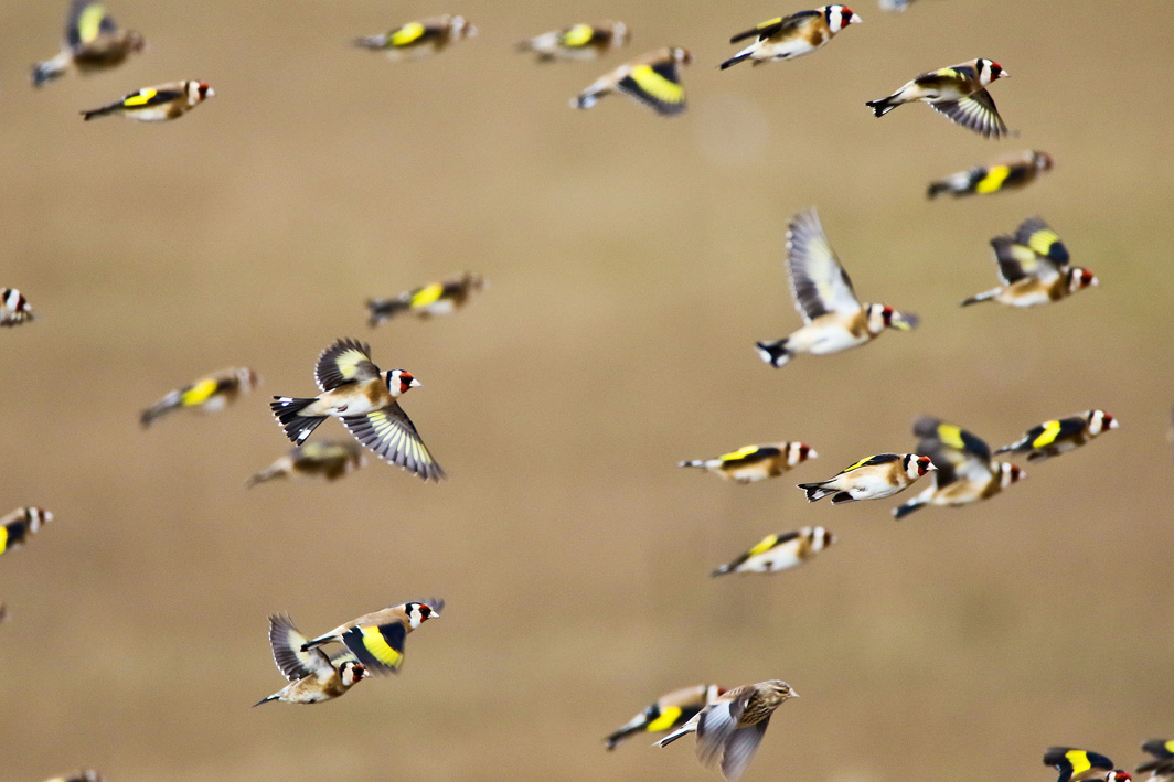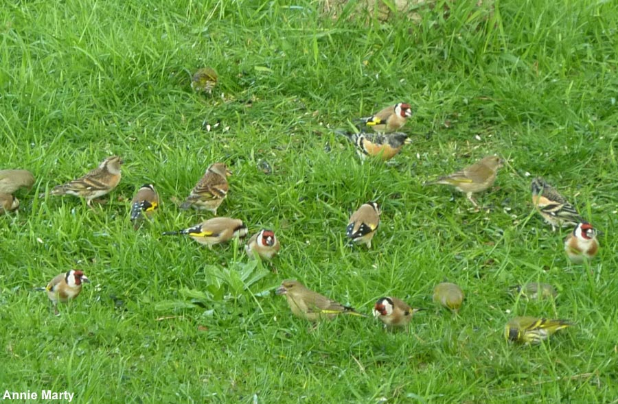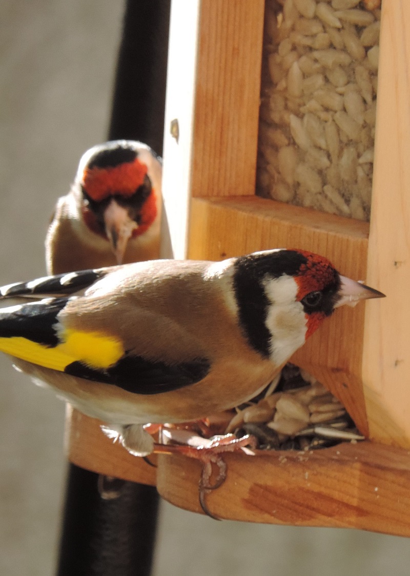 Photo prise le 16/01/2018. L'hiver, les mangeoires de la terrasse sont fréquentées assidûment par les chardonnerets élégants.