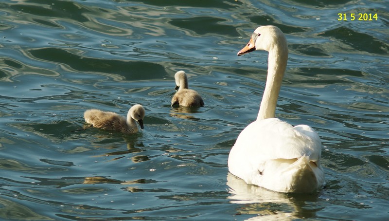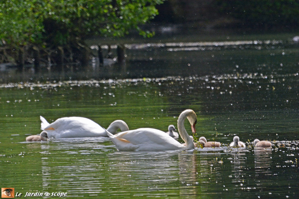 Cygnes père et mère alimentant leurs cygneaux nés début mai