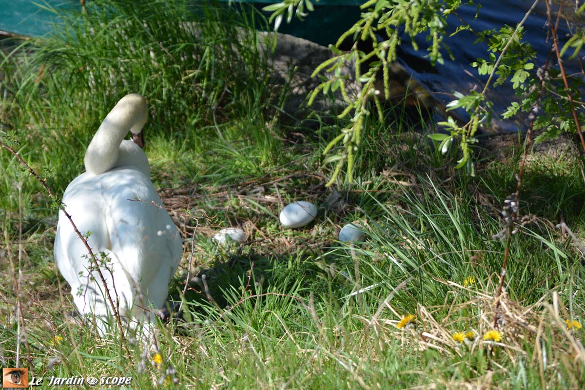 Un cygne et ses 3 œufs sur une berge du Loiret