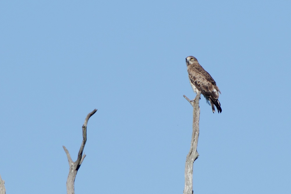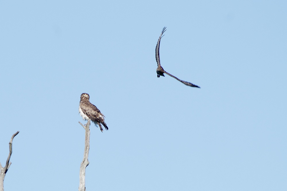 Photo prise le 14/08/2017. La Bondrée apivore a fait plusieurs tentatives pour essayer de déloger le circaète, mais sans succès.