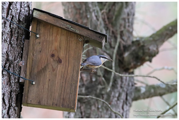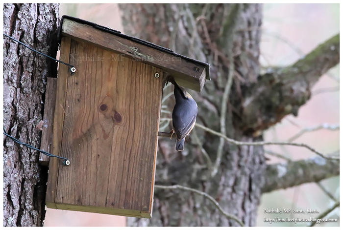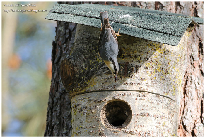Photo prise en 2016. Ce nichoir de type bûche était alors occupé par les sittelles. L'entrée du nid a été réduite avec du torchis. Visitez mon blog Birdwatching and Photography.