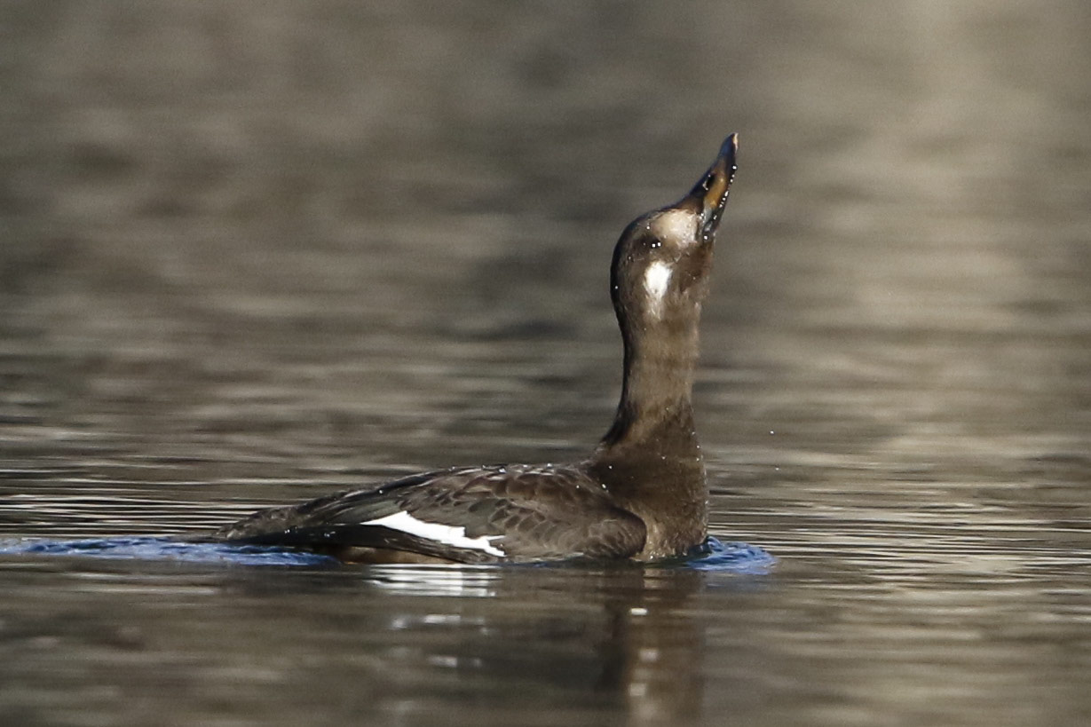 Photo prise durant la semaine du 15/12/2016. Il s'agit a priori un mâle de 1er hiver (ventre blanc visible sur d'autres photos). Pendant 4 h d'observation, de 8h à 12h, par 2 fois, cet individu a baissé la tête et le cou pour "laper" ou "récupérer" quelque chose dans l'eau, puis a levé son cou et sa tête dans cette position très particulière. Etait-ce simplement pour boire ?