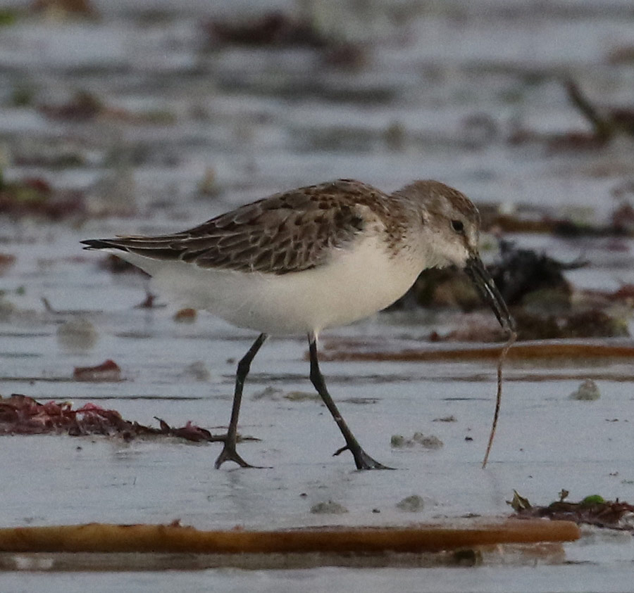 Photo d'Hugo Touzé prise le 7/10. Le plus rare des limicoles américains visibles en Europe. Niche en Alaska et en Sibérie orientale. Oiseau de première année découvert le 6/10, peu farouche. Petit bécasseau (14 à 17 cm de long contre 17 à 21 cm pour le Bécasseau variable). Bec assez long et arqué rappelant ceux des Bécasseaux variable et cocorli, larges sourcils blanchâtres, fines stries sur les côtés de la poitrine, pattes assez longues avec une ébauche de palmure, traces de roux sur les scapulaires (peu visible sur les photos).