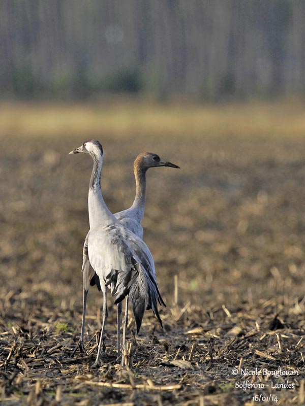 Grues cendrées adulte et juvénile dans les champs de maïs labourés