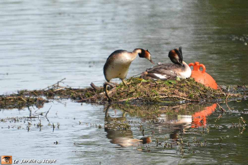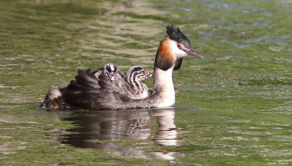Petite balade de deux poussins sur le dos de maman Grèbe huppé. Photo prise le 09/05/2015.