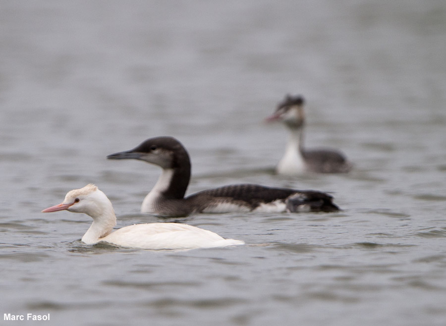Photo prise le 18/11. Avec un Plongeon arctique (Gavia arctica) et un Grèbe huppé en plumage normal. Lire L'albinisme et le leucisme chez les oiseaux