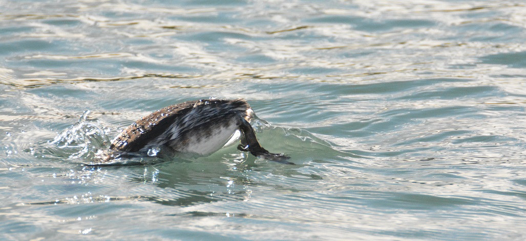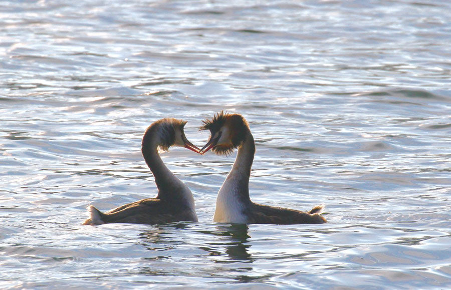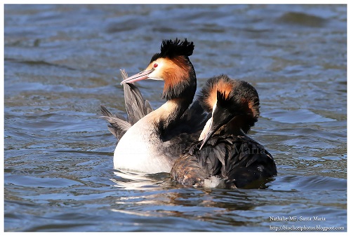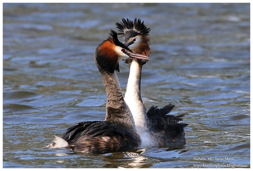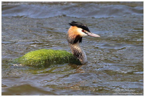 Photo prise le 29/02/2016. Pendant la parade nuptiale, le mâle offre des herbes sous marines ou algues à la femelle, elle remonte à la surface le dos recouvert de ces herbes. C'est l'annonce de la construction du nid. Ce jour-là, le couple plongeait en duo et remontait tous les deux des algues sur le dos. Visitez mon blog Birdwatching and Photography et lire Parade des Grèbes huppés : postures, danses et cérémonies.