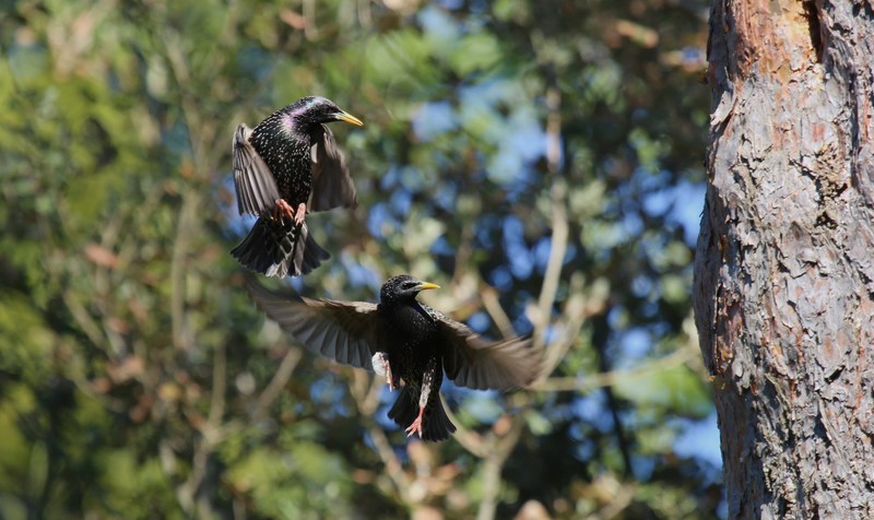 Photo prise le 05/05/2016. Ces Etourneaux sansonnets volaient devant leur nid où un écureuil roux avait élu domicile, sûrement l'endroit où il avait caché ses provisions...