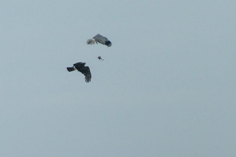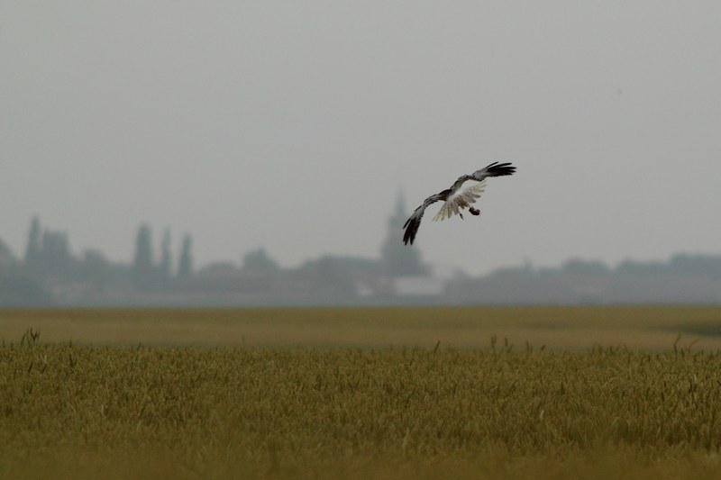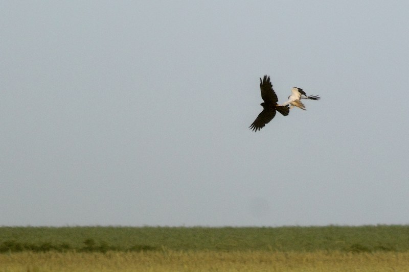 Photo réalisée le 15/06/2014 lors du suivi de la nidification des Busards Saint-Martin dans le Vexin. Le busard mâle chasse une corneille s'approchant du nid. Lire Corvidés et rapaces, des ennemis farouches ?/a>.