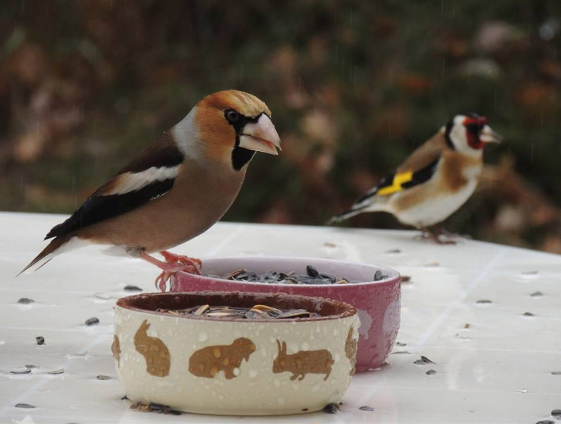 Gros-bec cassenoyaux à la mangeoire