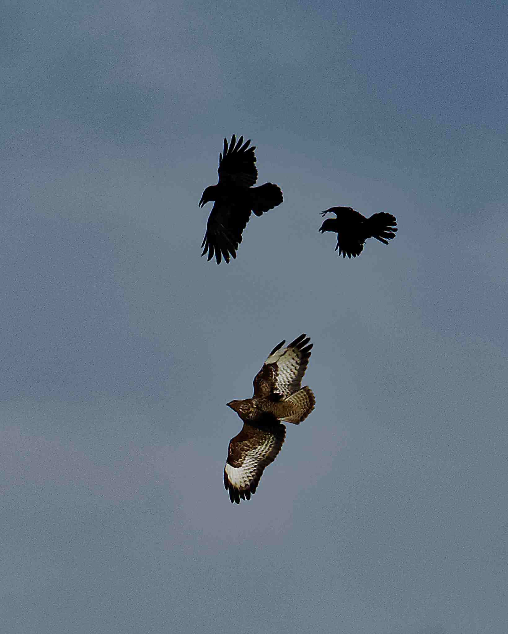 Buse variable chassée par deux corneilles