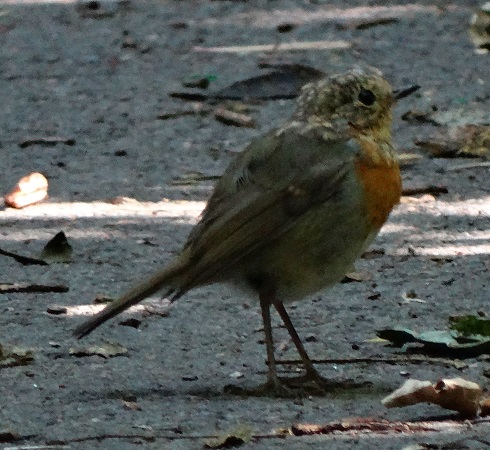 Photo prise le 15/07. Petit rougegorge en train de muer. Notez la poitrine rouge de l'adulte et le plumage juvénile sur le dos. Cette photo montre qu'à cette période de l'année les oiseaux changent de plumages.