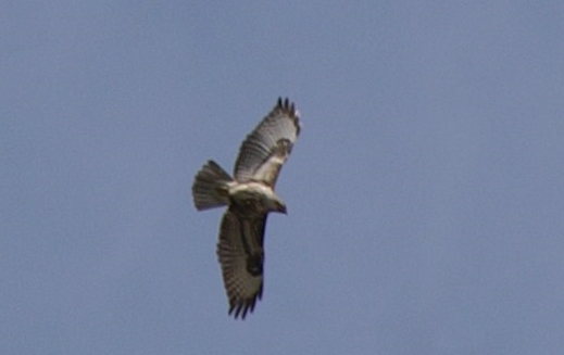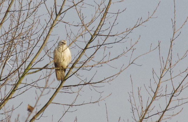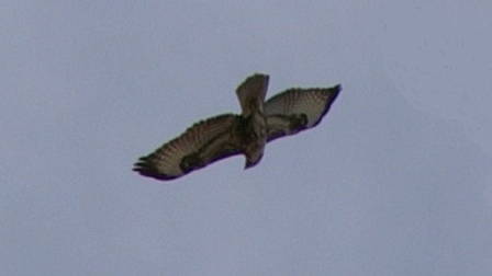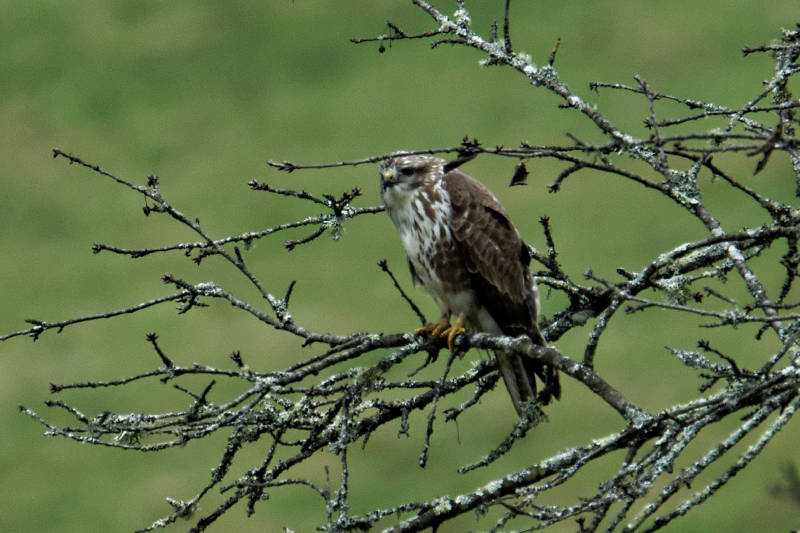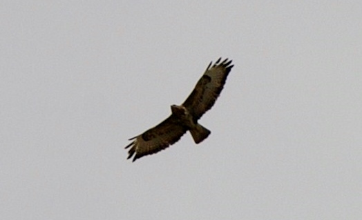 Photo prise en mai. La coloration de la Buse variable peut varier fortement, du brun foncé au blanc presque pur, en passant par toutes sortes de nuances intermédiaires. Les individus foncés avec une bande pectorale claire sont les plus nombreux.