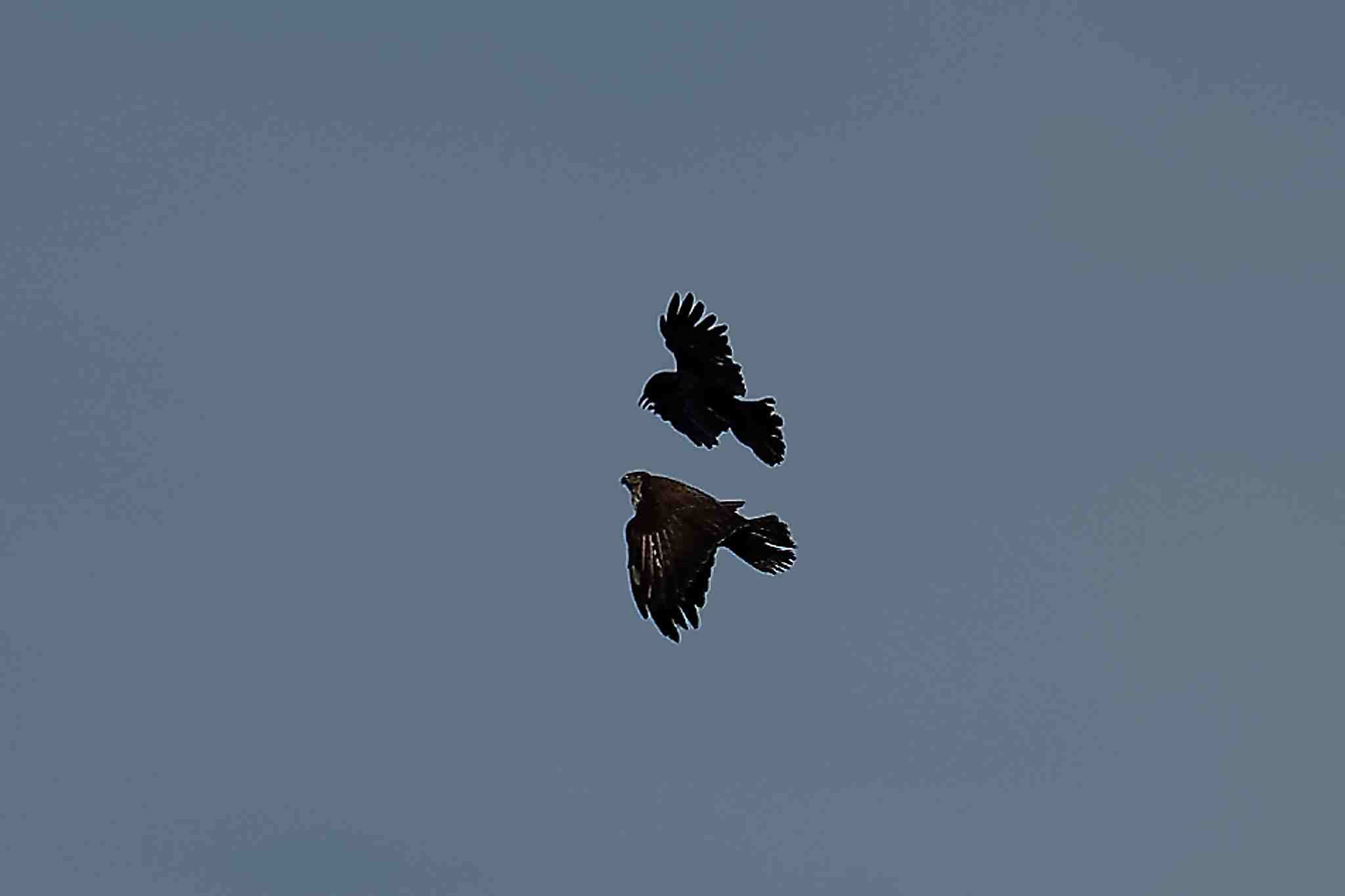 Il ne fait pas bon survoler le territoire des corneilles. Photo prise le 22/05. Lire Corvidés et rapaces, des ennemis farouches ?.