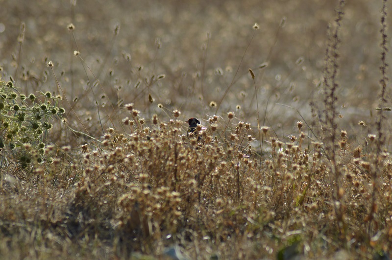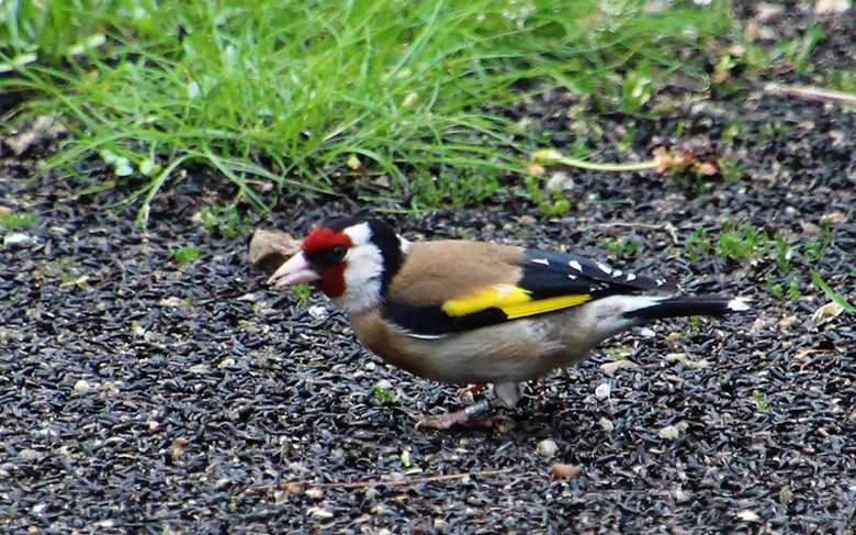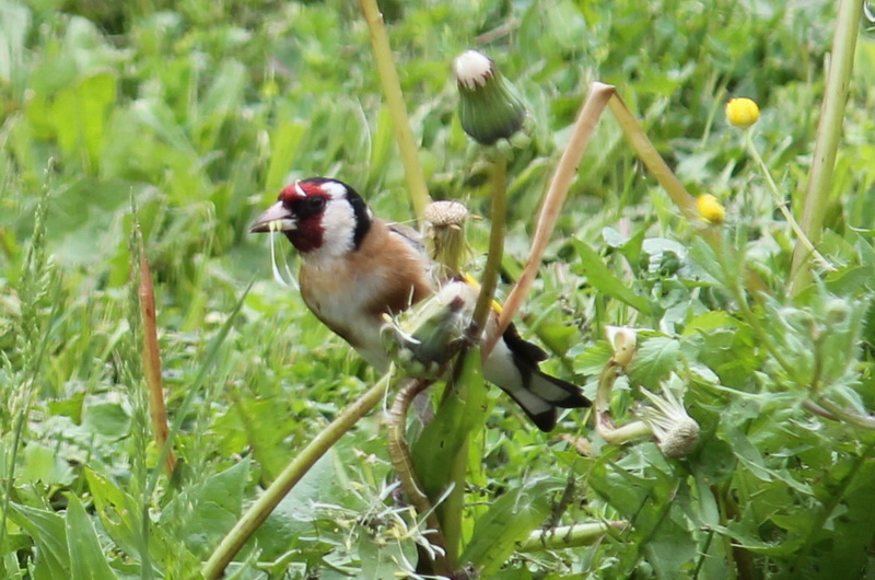 Photo prise le 1er mai. J'ai eu la surprise de le voir manger ces tiges de pissenlit devant la terrasse et je ne connaissais pas cet oiseau. Tout simplement beau. Cette photo montre l'intérêt de ne pas arracher toutes les "mauvaises herbes" de son jardin : lire Semez ou laissez pousser des fleurs qui produisent des graines pour les oiseaux et Aménager son jardin pour les oiseaux.