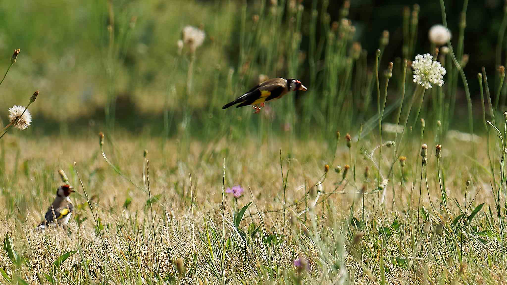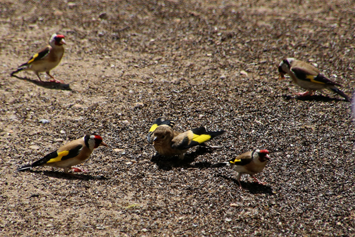 Toujours beaucoup de Chardonnerets élégants dans mon jardin, mais cette fois-ci avec leurs petits. Petits bien gros, je trouve. Petits qui quémandent mais l'adulte ne cède pas. Grosse différence avec les mésanges et les moineaux. Pourquoi?