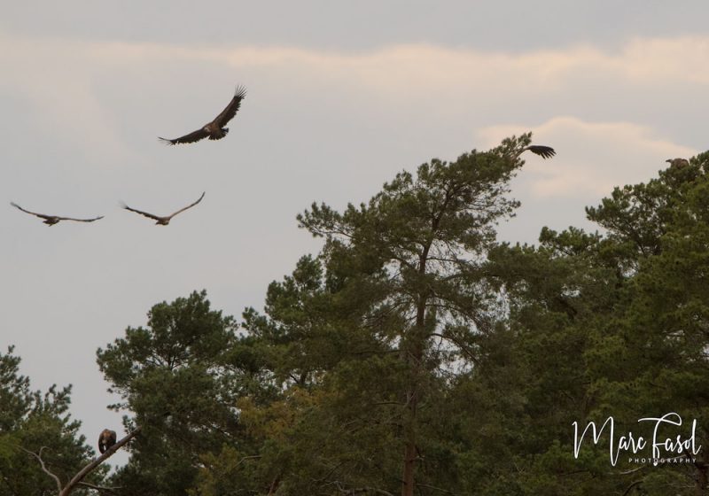 Vautours fauves (Gyps fulvus) posés le 10 mai 2021 dans une pinède près de Villers-la-Ville dans le Brabant wallon (Belgique).