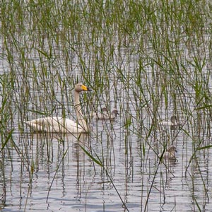 Famille de Cygnes chanteurs (Cygnus cygnus), lac Leppävesi, Jyväskylä, Finlande, juin 2009.Photographie : Oskari Kettune / Wikimedia Commons